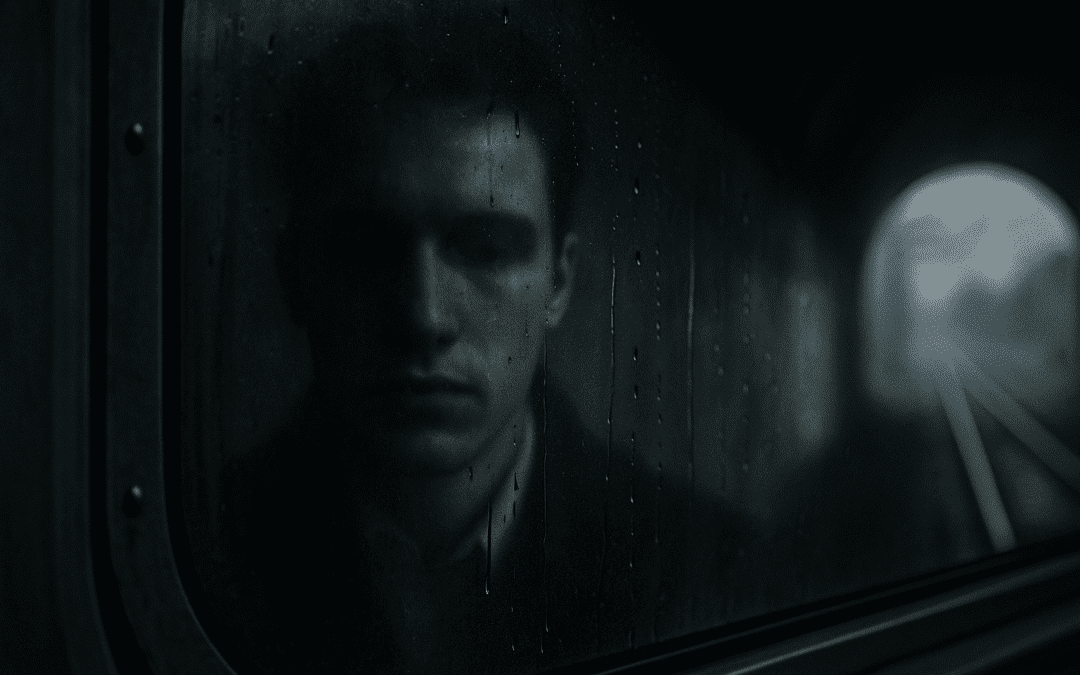 El joven junto a la ventanilla del tren fue sorprendido por un túnel cuya oscuridad repentina le devolvió, como una burla, su propio rostro pálido temblando sobre el cristal. Su expresión, la boca entreabierta y las gotas de lluvia que se deslizaban como mercurio sobre su reflejo, le dieron por un instante, la sensación de haber caído en una trampa. Negó con la cabeza ante su sobresalto, metió la mano en el bolsillo interior del abrigo y dejó que el anillo del dedo medio girara entre sus dedos, como si en ese pequeño movimiento se jugara la estabilidad del momento. Al hacerlo, rozó la tela húmeda de la camisa y sintió el sudor enfriarse sobre la piel.